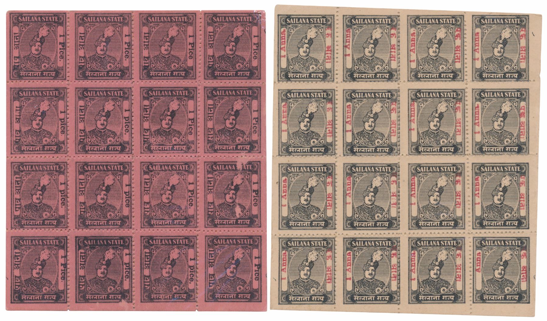 Sailana, 2 Cash Coupon sheets, the first 1 Pice (1/4 Anna) denomination with 16 pcs. equivalent to 4 Annas, the second 1 Anna denomination with 16 pcs. equivalent to 1 Rupee, the second with Error, the last coupon on the bottom right corner without the digit ‘1’ in the denomination panel; the serial number, denomination and date 1943 in Devanagari on rev. (J&R 10.32.1 & 10.32.2). Uncirculated, Very Rare, comes with exhibition mounted information sheets. (2) Ex. Shri Praful Thakkar, I.A.S. (Retd) Collection