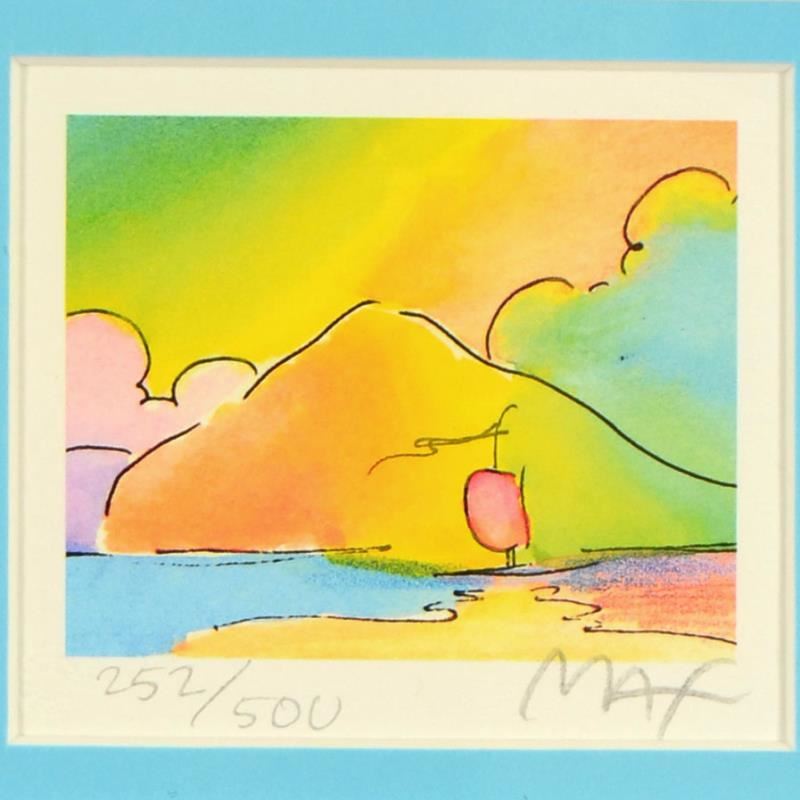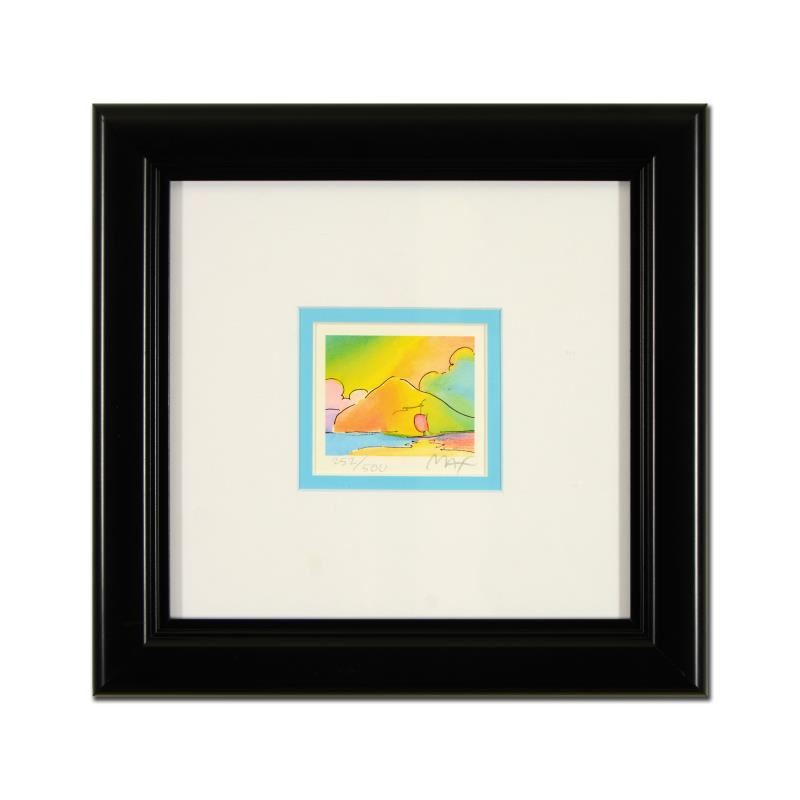 "Sailboat And Mountain," is a limited edition lithograph on paper by Peter Max, numbered 252/500 and hand signed by the artist. Includes Certificate of Authenticity from Peter Max Studios. Measures approx. 10.5"x 10.5" (frame), 2.5"x 2.5" (image).