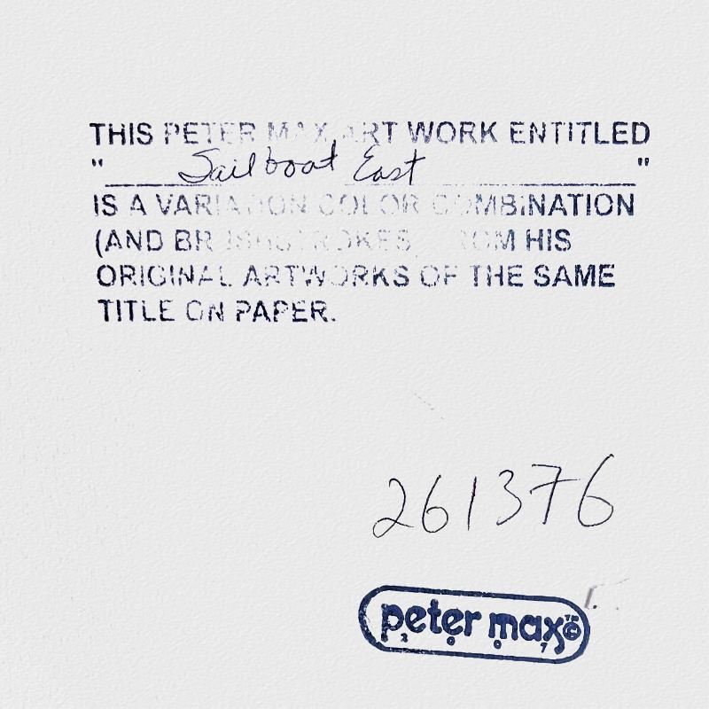 "Sailboat East" is a hand signed one-of-a-kind acrylic mixed media on paper by Peter Max. The piece comes custom framed with a backside cutout to display Peter Max Studio registration number 261376 certifying authenticity. Measures approximately 30" x 26" (frame), 17" x 13" (image). This item requires special handling and may have a longer than usual turnaround.