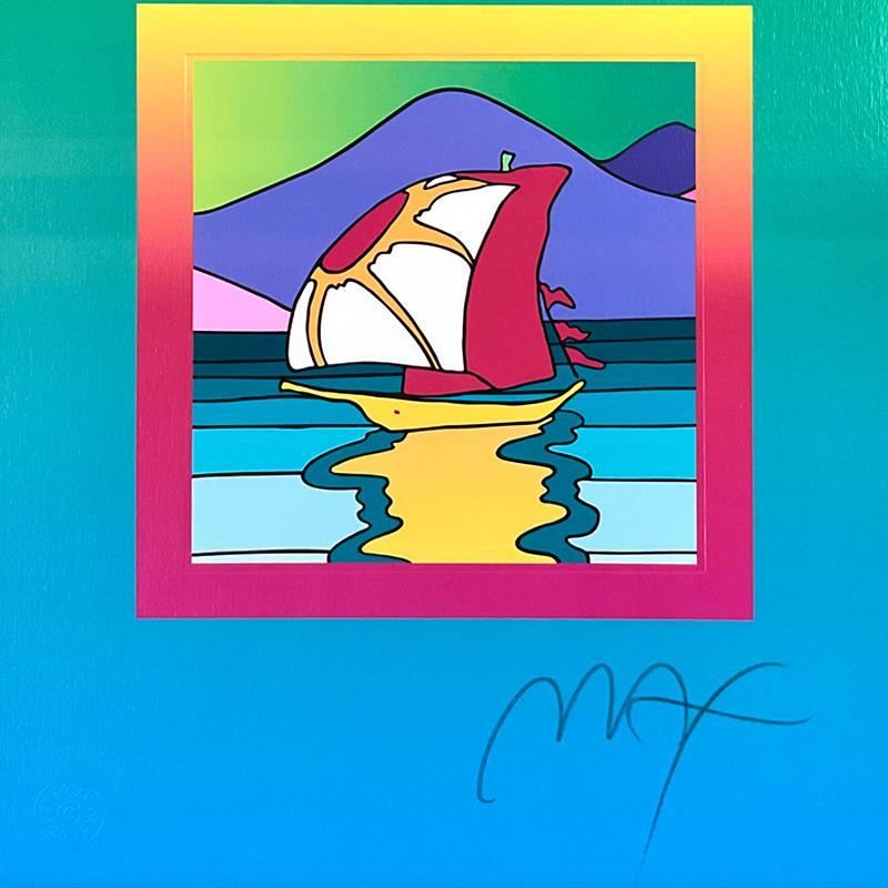 "Sailboat East on Blends Ver. II" is a limited edition lithograph on paper by Peter Max numbered and hand signed by the artist. This piece comes framed. Includes Certificate of Authenticity from Peter Max Studios. Measures approx. 23" x 20" (frame) 13" x 10" (image).