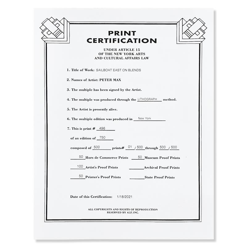 "Sailboat East on Blends" is a limited edition lithograph on paper by Peter Max, numbered 496/500 and hand signed by the artist. This piece comes framed and includes Certificate of Authenticity from Peter Max Studios. Measures approximately 30.5" x 26.5 (