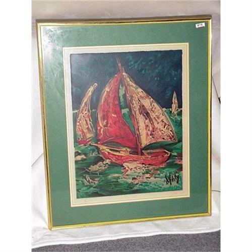 Signed. "Mauty ?", framed lithograph, Frame is: 27" x 32 1/2". Image is: 19" x 24 3/4". Scene depicting sailboats in lake storm.