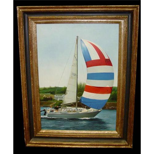 Colorful sailboat scene oil on canvas painting signed lower right measures 20 by 28 inches mounted in a parcel gilt wood frame measuring 28 by 36 inches and would make a great gift or addition to any fine collection.