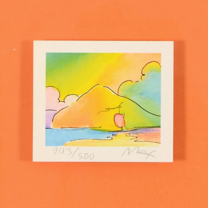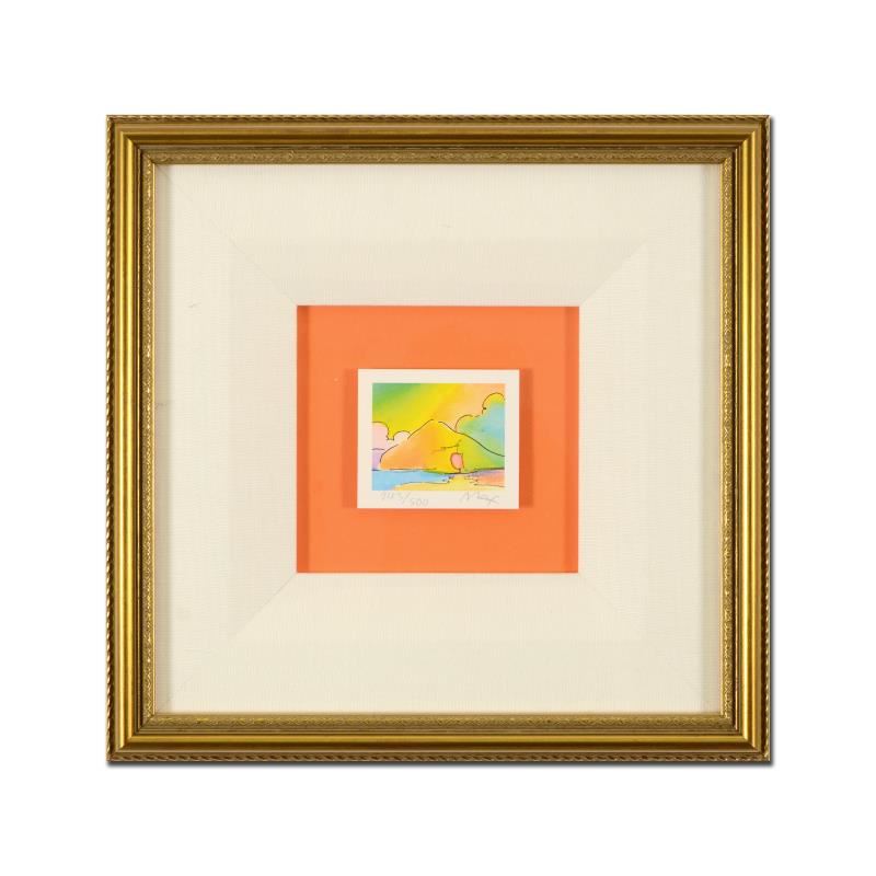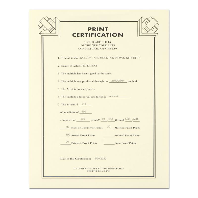 "Sailboat and Mountain View" is a limited edition lithograph on paper by Peter Max, numbered 243/500 and hand signed by the artist. This piece comes framed and includes Certificate of Authenticity. Measures approximately 13" x 13" (frame), 2.5" x 3" (image).