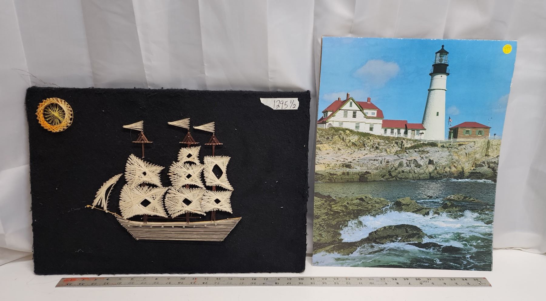 Sailboat string art, on velvet and thick wood & Lighthouse print