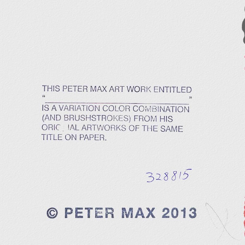 "Sailboat with Heart" is a one-of-a-kind acrylic mixed media on paper, hand signed by Peter Max. The piece comes custom framed with a backside cutout to display Peter Max Studio registration number 328815 certifying authenticity. Measures approximately 24" x 22" (frame), 10" x 8" (image). This item requires special handling and may have a longer than usual turnaround.
