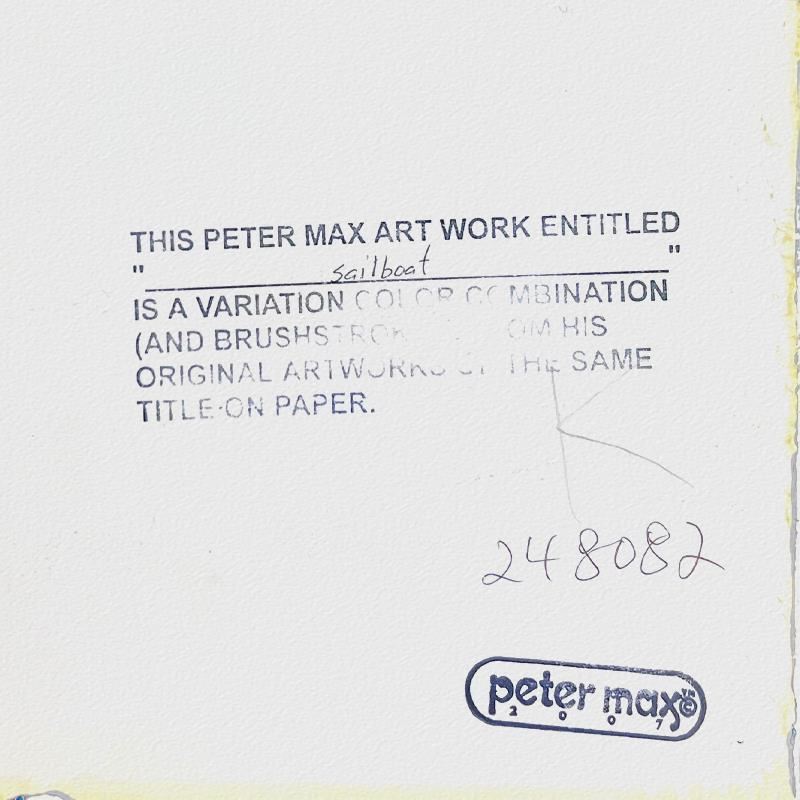 "Sailboat with Heart" is a one-of-a-kind acrylic mixed media on paper, hand signed by Peter Max. The piece comes custom framed with a backside cutout to display Peter Max Studio registration number 248082 certifying authenticity. Measures approximately 24" x 22" (frame), 10" x 8" (image). This item requires special handling and may have a longer than usual turnaround.