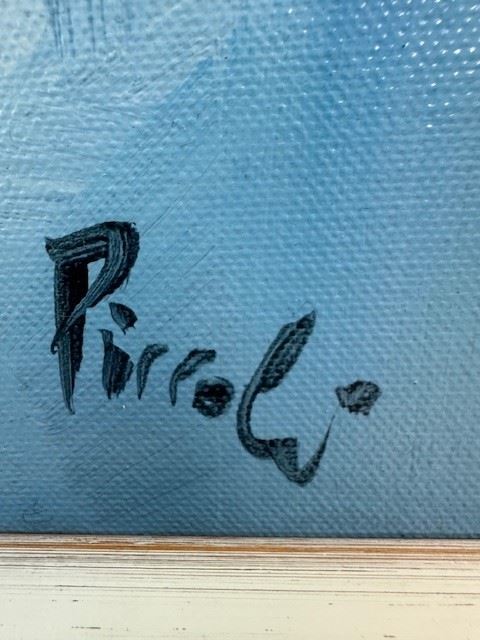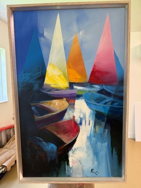 A vibrant rendering of Sailboats at rest by renown Italian artist Lucien Piccoli. Oil on canvas 31 x 19" plus new 32.5x 21" frame.