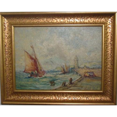 Painting by Francis E Jamieson under the pseudonym Aubrey Ramus.Label states it was shown at the Royal Scottish academy in 1943., Francies e. Jamieson of Aubery Ramus is an English Artist who, after a holiday to the highlands of scotland , became obsessed with painting highland landscapes and became one of the most profilic artists of his time , Ramus is believed to have painted under eleven different artist names These Aliases include J. McGreger, Graham Williams nd W. Richard other Pseodonyms that include Aubery Ramus and Stanley Penn .The Popularity of Jamieson remains strong to this day and his canvases are in great demand. The Lovely bright image of sailing ships painted with impressionist brushstrokes. Frame is a beautiful hammered gold with bronze accents. It looks wonderful with the image.Aubery Ramus was an English artist who after a holiday to the highlands of Scotland, became obsessed with painting the highland landscapes and became one of the most prolific artists of his time. The painting is 12'x 16'. It is signed and in excellent condition. Ramus Painting - Off Gosport, Sussex ( Oil painting ) was sold at Christie's - South Kensington, UK 19 - Jan-1995 for 1745 US$