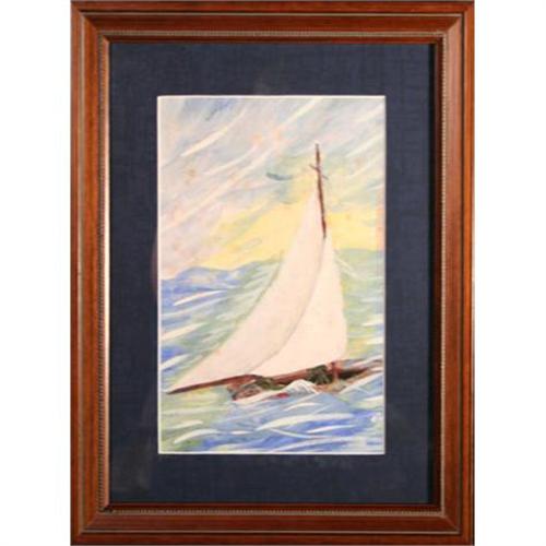 Don Pettibone?s original watercolor entitled, ?Sailing? is a delightful illustration of a sailboat on the sea. Long, sweeping brushstrokes along the water and in the air give wonderful energy and movement to the composition. The soft glow of the sunset is reflected along the water in strokes of green. The painting has been matted in deep navy to draw out the dark blue of the rolling waves. The piece is mounted in a medium brown wood frame with intricate beading around the perimeter and blue-gray accents. Including the handsome frame, this painting measures 14 ¼? x 18 ½? and is signed ?Don Pettibone, 1965? on the back. The unique matting and framing presentation of this piece was individually selected and created by Le Chateau?s renowned master framer, Jeanette Shoenrock, and bears her signature on the back. This is truly a lovely maritime painting that would be an affordable addition to any collection, or perfect gift for the sailing enthusiast in your family.