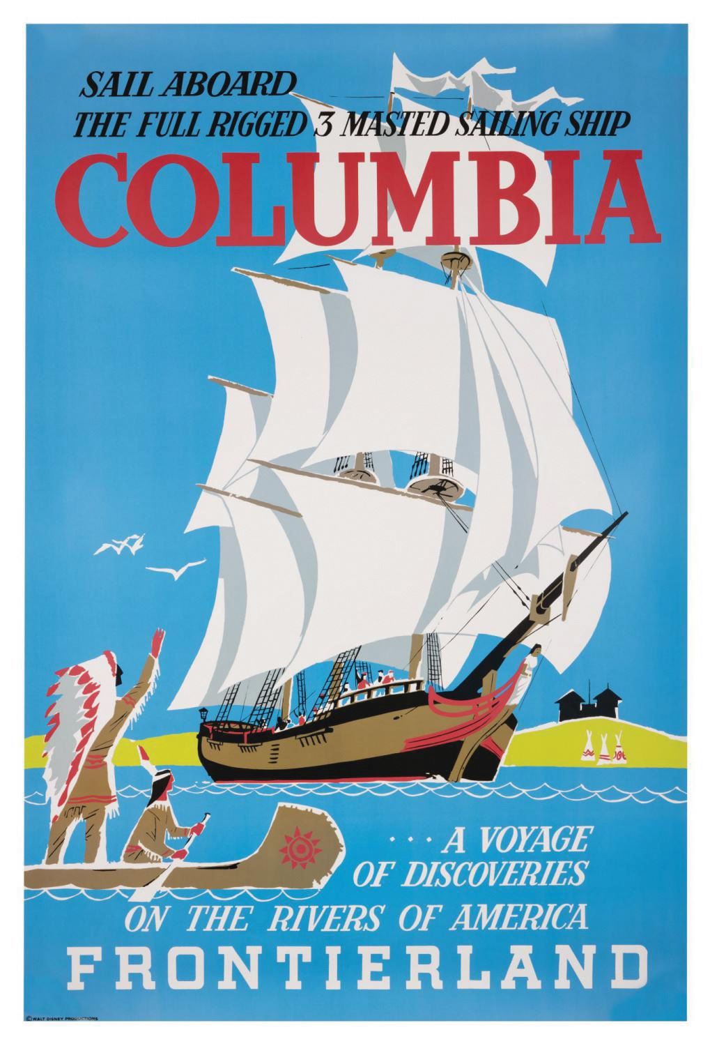 (Disneyland, 1958) A hand-silkscreened attraction poster for the Sailing Ship Columbia. Designer Bjorn Aronson's bold imagery captures the sense of exploration and discovery aboard the replica 18th century vessel as it sailed on the Rivers of America. The poster measures 54"x36" and is in very good condition. Despite minor wear to the edges and corners and mild color toning exhibited on the reverse, the dynamic layout and vibrant colors of the piece display beautifully.