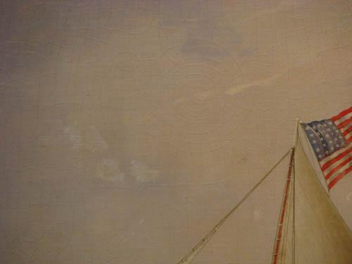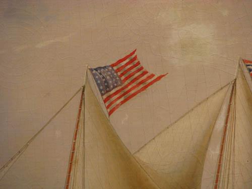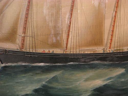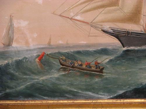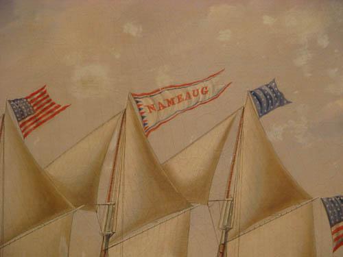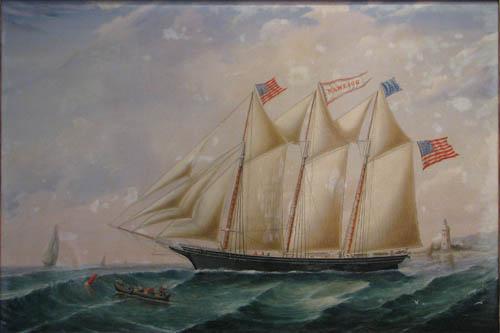 Description: purchased in a Rhode Island Antique Shop, the painting features the Sailing Ship Nameaug coming in on a Lighthouse with a smaller fishing boat in the foreground.