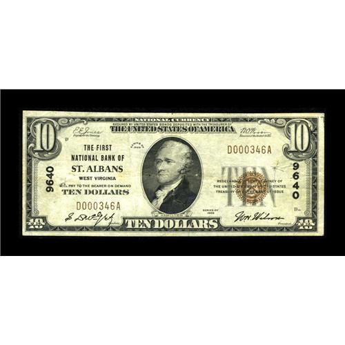 <B>Saint Albans, WV</B></I> - $10 1929 Ty. 1 <B>The First NB</B></I> Ch. # 9640<BR>Just seven of the 1929 series have been traced from here. The example we offer tonight is a problem free <B>Very Fine,</B></I> likely to realize no less than...<BR><BR><b>Shipping:</b> Coin/Currency (<a target="_blank" href="http://www.heritageauctions.com/common/shipping.php">view shipping information</a>)