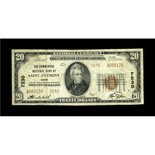 <B>Saint Anthony, ID</B></I> - $20 1929 Ty. 2 <B>The Commercial NB</B></I> Ch. # 7230<BR>This is a scarce note from the only bank in Saint Anthony to issue Series 1929 examples, with this piece one of only two Type 2 twenties in the census. <B>Fine,</B></I> with a couple of minor pinholes.<BR><BR><b>Shipping:</b> Coin/Currency (<a target="_blank" href="http://www.heritageauctions.com/common/shipping.php">view shipping information</a>)