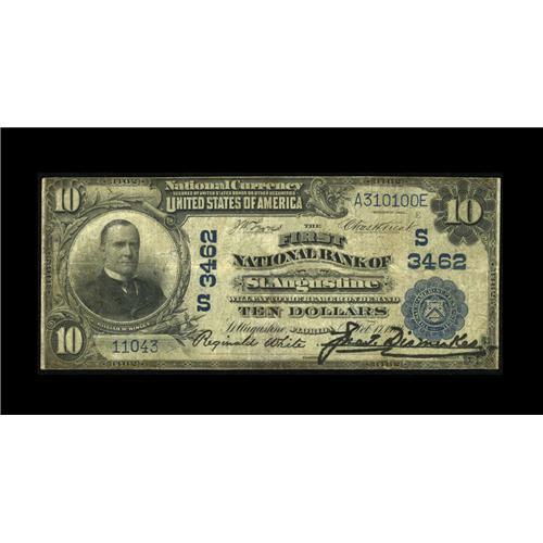 <B>Saint Augustine, FL</B></I> - $10 1902 Plain Back Fr. 625 <B>The First NB</B></I> Ch. # (S)3462<BR>The printed signatures are dark on this note from the earliest chartered of the two banks to issue from here. <B>Very Good-Fine.</B></I><BR><BR><b>Shipping:</b> Coin/Currency (<a target="_blank" href="http://www.heritageauctions.com/common/shipping.php">view shipping information</a>)