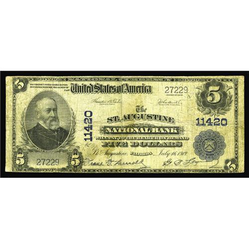 <B>Saint Augustine, FL</B></I> - $5 1902 Plain Back Fr. 606 <B>The St. Augustine NB</B></I> Ch. # 11420<BR>A quite presentable <B>Very Good</B></I> with fully legible signatures. We sold another $5 Plain Back from here in this same grade at our 2004 Milwaukee CSNS auction for $1,092.50. In an even stronger market for scarce Nationals, tonight's offering should surpass that realization.