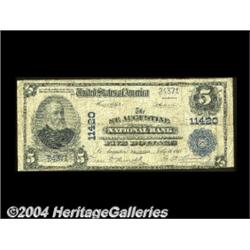 Saint Augustine, FL - $5 1902 Plain Back Fr. 606 The St. Augustine NB Ch. # 11420A very scarce bank in large size, with just seven such examples listed in the Kelly census. Well circulated but quite intact Very Good, with clear signatures. <BR><BR><B>Important notice:</B> Heritage usually auctions material at the rate of 200-250 lots per hour. On some occasions eBay Live bid software or the Internet may not be able to keep up with the pace of the auction. We recommend placing a realistic absentee bid now as insurance to avoid disappointment. Occasionally the auctioneer may eliminate or reject an eBay Live bid, and the auctioneer may also reopen a lot after the close of the eBay live bidding (usually because we missed an audience bid), and may reject your bid even if it shows you as the winning bidder. By bidding via eBay Live, you agree that Heritage may award the lot to another bidder at its sole discretion under the circumstances described above or any other reasonable circumstances. Since eBay bids are not shown to us until we open the lot on the floor, we treat those bids just like floor bids. In most cases the floor responds before the eBay bid is presented to us, due to Internet lag time, so for consistency we have made it a policy that floor bids are always considered first over tie eBay live bids. Also please note that all Heritage lots purchased through eBay Live carry a 20% Buyer's Premium. Please make sure you read the Terms and Conditions before you bid. <BR><BR><B>IMPORTANT ANNOUNCEMENT ABOUT RESERVES:</B> Heritage now divulges all reserves on its web site 7 days before every auction. If you want to know whether the reserve on this lot has been met, and if not, what the reserve amount is, please visit this lot page on the HeritageCoin.com web site, or email: bid@HeritageGalleries.com
