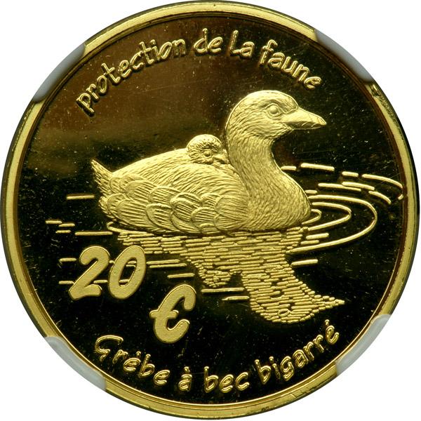 Saint Barthelemy. Essai 20 Euro, 2004. KM-#XE15. Weight 0.25000 ounce. Pied-billed Grebe. Only 300 proofs struck. NGC graded Proof 68 Ultra Cameo.