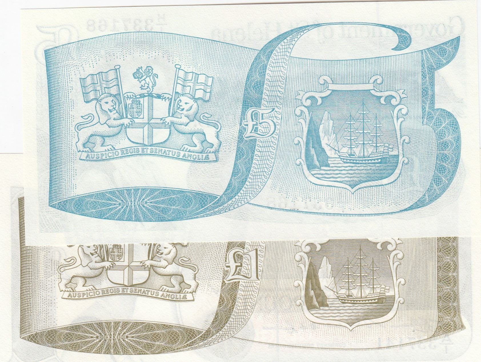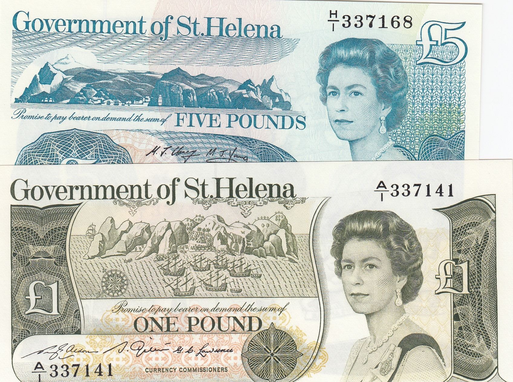 Saint Helena, 1 Pound and 5 Pounds, 1981/1998, UNC, p9, p11, (Total 2 banknotes)br/Queen Elizabeth II portrait, serial numbers: A/1 337141 and H/1 337168