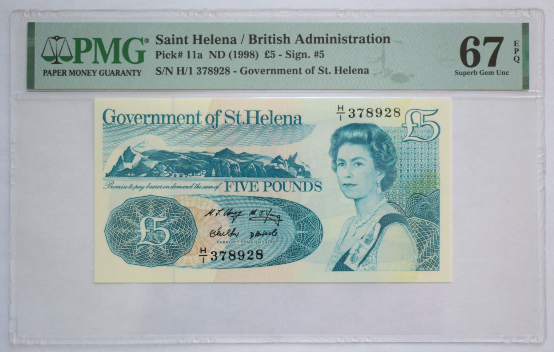 Saint Helena, British Adm. £5 ND (1998) QEII Pick #11a Superb Gem UNC-67 "EPQ", Better grade