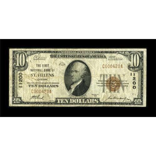 <B>Saint Helens, OR</B></I> - $10 1929 Ty. 1 <B>The First NB</B></I> Ch. # 11200<BR> While the number of small and large notes from this one bank community is roughly equal, appearances at public sale are another story entirely, with large notes outnumbering small by a two to one margin since 1985. <B>About Fine.</B></I><BR><BR><b>Shipping:</b> Coins & Currency (<a target="_blank" href="http://www.heritageauctions.com/common/shipping.php">view shipping information</a>)