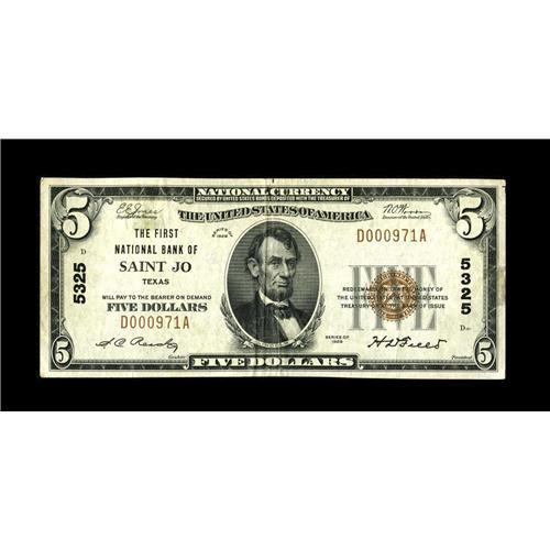 <B>Saint Jo, TX</B></I> - $5 1929 Ty. 1 <B>The First NB</B></I> Ch. # 5325<BR>A very scarce Montague County bank, especially in this state of preservation. Bright <B>Very Fine.</B></I><BR><BR><b>Shipping:</b> Coin/Currency (<a target="_blank" href="http://www.heritageauctions.com/common/shipping.php">view shipping information</a>)