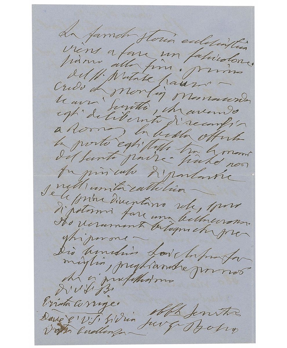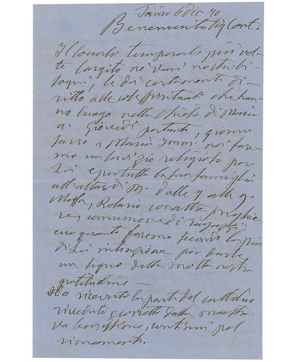 Italian priest (1815–1888), who, in recognition of his work on behalf of disadvantaged youth, was canonized in 1934. Rare ALS in Italian, signed “Sac. G. Bosco,” one page both sides, 5.25 x 8.25, December 6, 1870. A substantial letter to his great benefactor countess Carlota Callori di Vignale announcing commemorative masses, the preparation for Christmas, and work being done in his institutions thanks to the countess’s financial help. In fine condition.