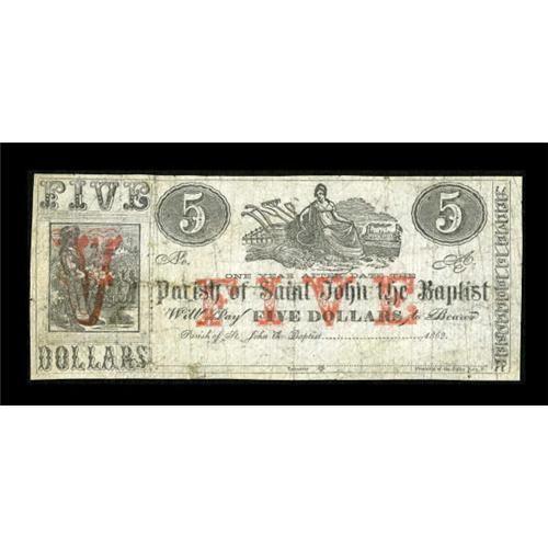 <B>Saint John the Baptist Parish, LA- Parish of Saint John the Baptist</B></I> $5 <BR> Unlike the lower denominations from this Parish, the $5 note is extremely rare. This piece appears <B>Very Good </B></I>or better, but has extensive repairs. <BR><I>From The Collection of a Louisiana Gentleman.</B></I><BR><BR><b>Shipping:</b> Coins & Currency (<a target="_blank" href="http://www.heritageauctions.com/common/shipping.php">view shipping information</a>)