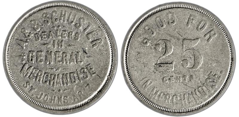 Obverse: A & B. Schuster / Dealers In / General / Merchandise / St. Johns, Ariz.; reverse: Good For / 5 / Cents / In Trade. Al, 25mm, R10. Extremely fine condition. Named by Mexican settlers for San Juan's Day. Mexicans were the first to settle the area but Mormon colonists were close behind. Both groups lived together but there was anti Mormon sentiment. In 1880, the town was officially named St. Johns when the post office was established [Barnes, 1988, 374-375].
