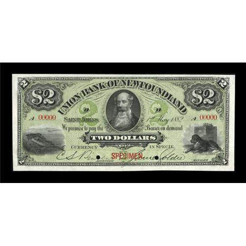 <B>Saint Johns, NF- Union Bank of Newfoundland</B></I> $2 May 1, 1882 Ch. 750-16-02S Specimen<BR> This ABNCo of New York specimen $2 has been nicely preserved. The note has serial number 00000, it is punch cancelled through the signatures, and it has a red overprint of "SPECIMEN." A little bit of handling is found in the dog and safe vignette area. <B>Choice Crisp Uncirculated</B></I>.<BR><BR><b>Shipping:</b> Coins & Currency (<a target="_blank" href="http://www.heritageauctions.com/common/shipping.php">view shipping information</a>)