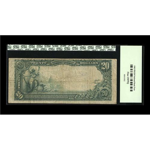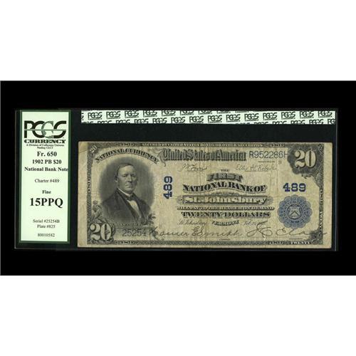 <B>Saint Johnsbury, VT</B></I> - $20 1902 Plain Back Fr. 650 <B>The First NB</B></I> Ch. # 489<BR>Although relatively common in small size, large examples from here rarely appear on the market, with this the first we've had to offer in several years. It has been graded <B>Fine 15PPQ</B></I> by PCGS, a grade with which we have no disagreement at all.