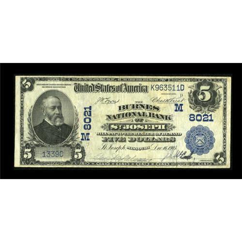 <B>Saint Joseph, MO</B></I> - $5 1902 Plain Back Fr. 599 <B>The Burnes NB</B></I> Ch. # (M)8021<BR> A nice large size example from this well collected community. <B>Fine-Very Fine.</B></I><BR><BR><b>Shipping:</b> Coins & Currency (<a target="_blank" href="http://www.heritageauctions.com/common/shipping.php">view shipping information</a>)