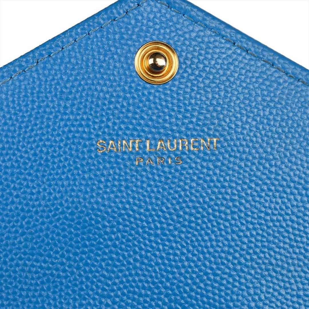 100% Large Monogram Saint Laurent Flap Wallet in Powder Blue Grain De Poudre textured Calfskin Leather featuring central gold-toned, metal interlocking YSL buckle and Matelassé (chevron) stitching. Snap closure opens to a leather lined interior offering 12 cards slots, 1 zippered coin compartment, 2 bill compartments and 1 receipt compartment. This wallet is in great pre-loved condition with minor signs of wear. Please see pictures. Comes complete with original Saint Laurent box and drawstring dustbag. Approximate Dimensions: 7.4" x 4.3" X 1.2" Made in Italy.