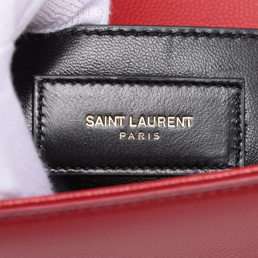 Red grained leather Saint Laurent Kate small shoulder bag with gold-tone hardware, chain-link shoulder strap, YSL monogram enamel at front flap. magnetic clasp closure at the flap that will open to black grosgrain canvas lining and one slip pocket inside.