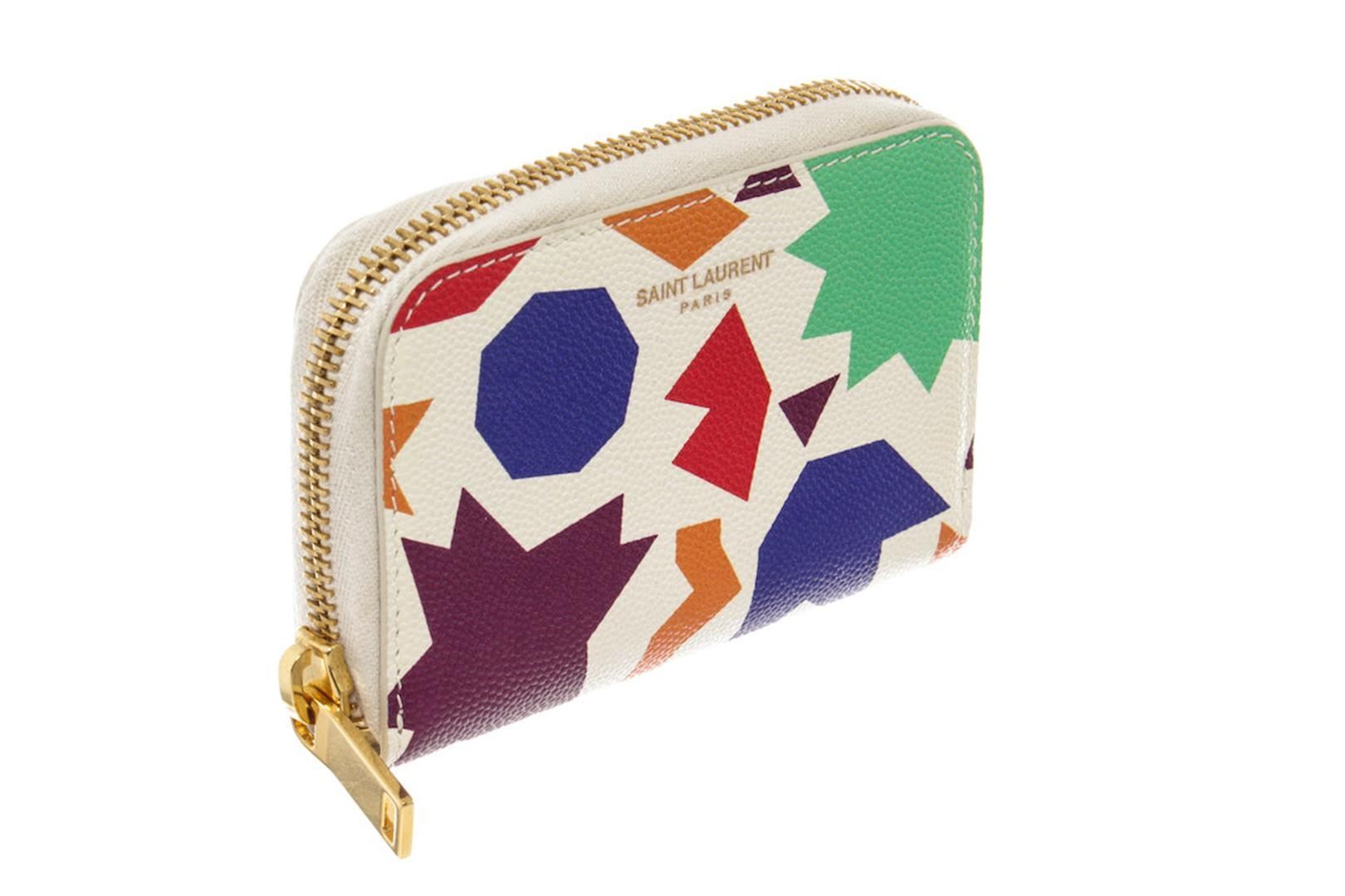 One Saint Laurent White Multicolor Leather Small-Shapes Print Compact Zippy Wallet. Item is sold AS-IS. All available information is listed in the description and shown in the photo. White grained leather featuring multicolor printed flame patterns Saint Laurent Compact Zippy wallet with gold-tone hardware, Saint Laurent logo stamp at front, zip-around closure, black leather lining and three main compartments. 4.75" length x 3.5" height x 1.5" width