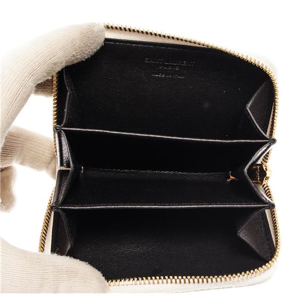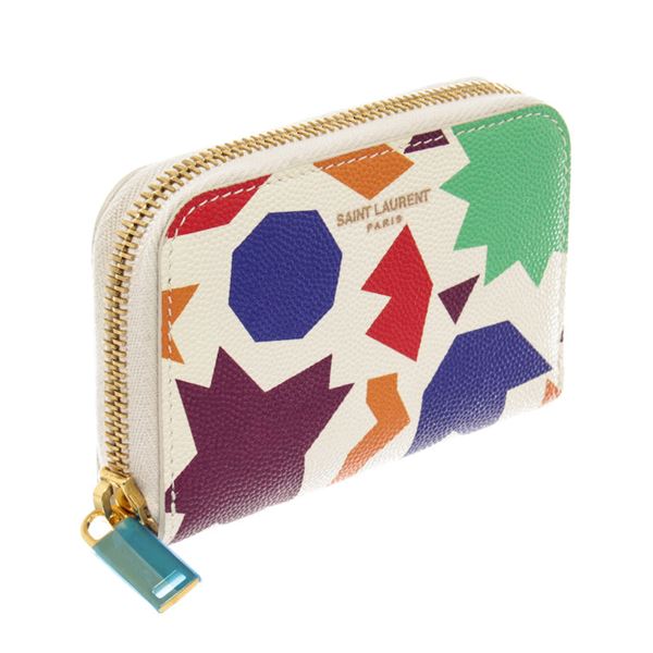 One Saint Laurent White Multicolor Leather Small-Shapes Print Compact Zippy Wallet. Item is sold AS-... Show more..