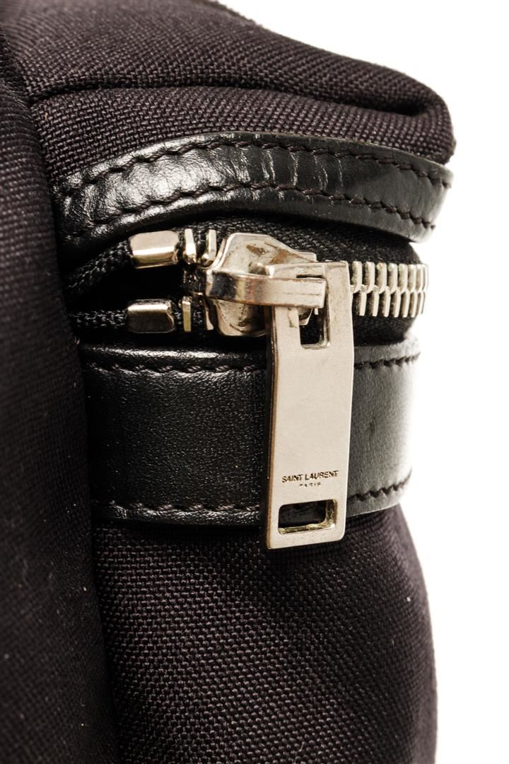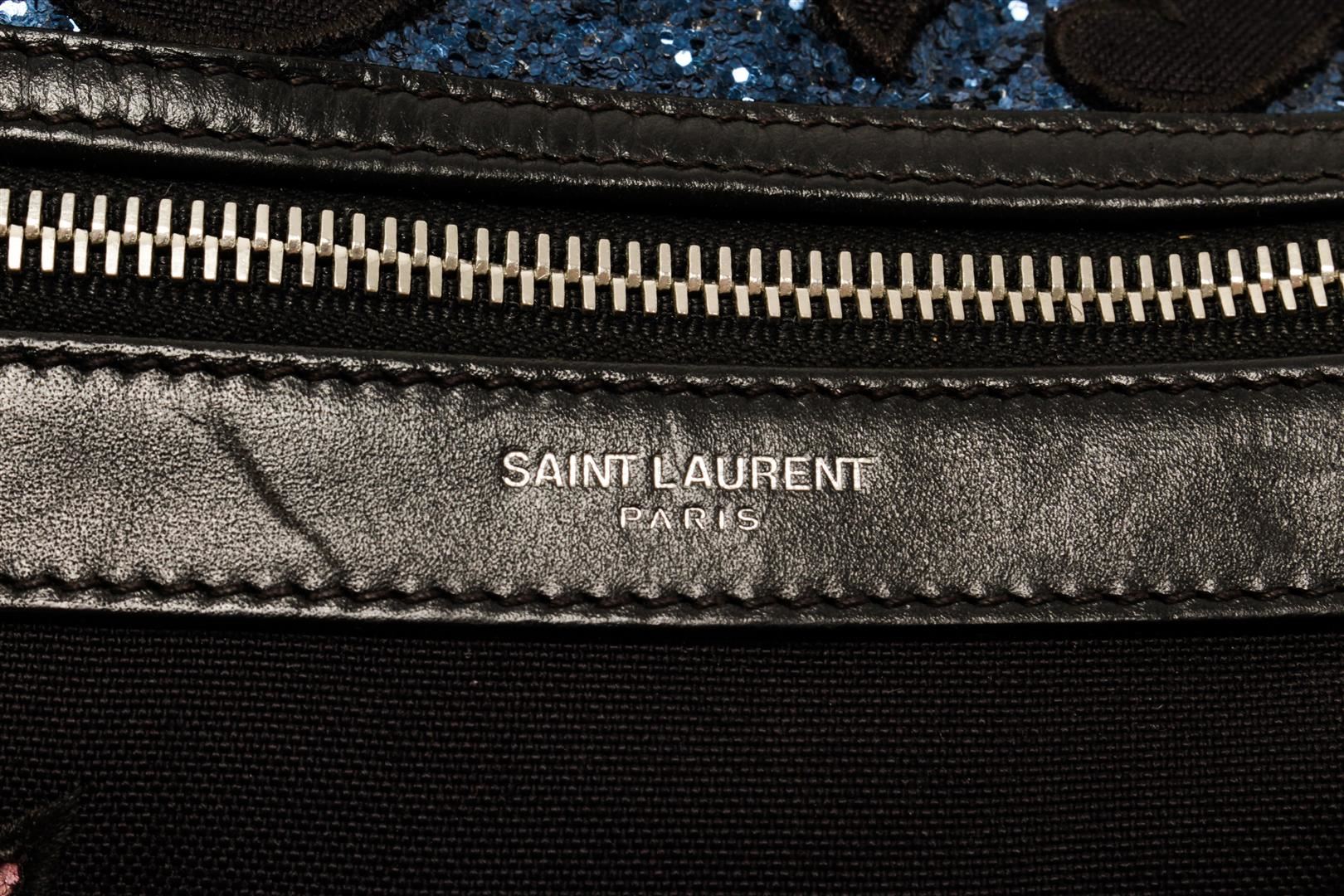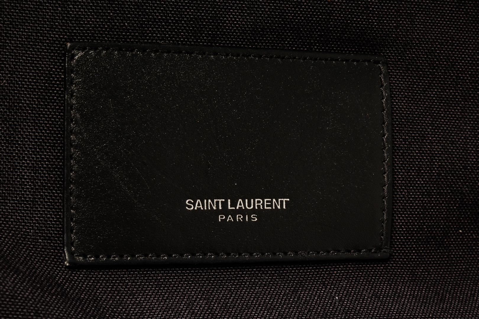 One Saint Laurent YSL Black Tropical Canvas Backpack. Item is sold AS-IS. All available information is listed in the description and shown in the photo. YSL Black Tropical Canvas Backpack with exterior zipper pocket, silver hardware, canvas lining, adjustable straps, top handle, palm trees and wave designs.
