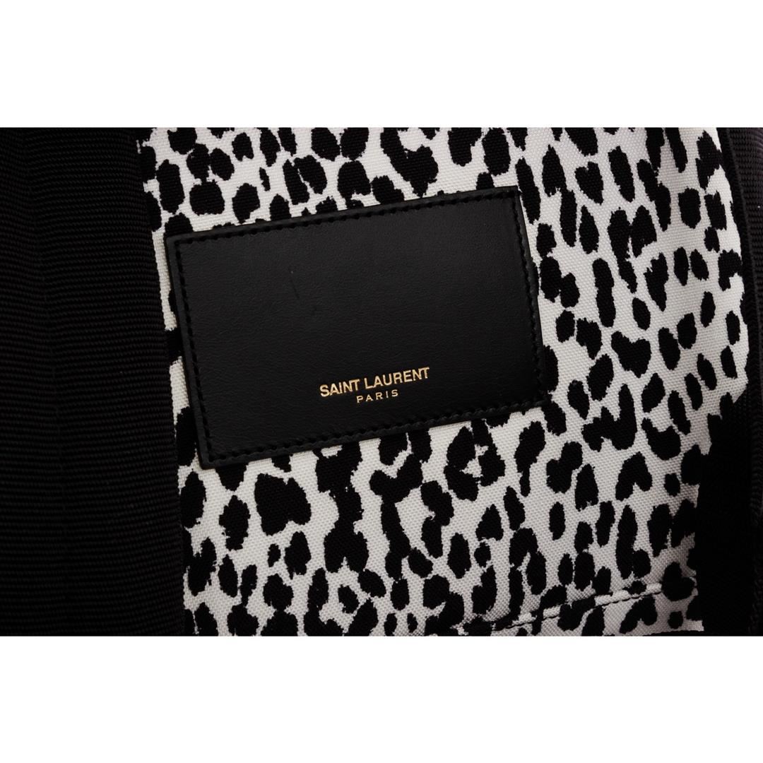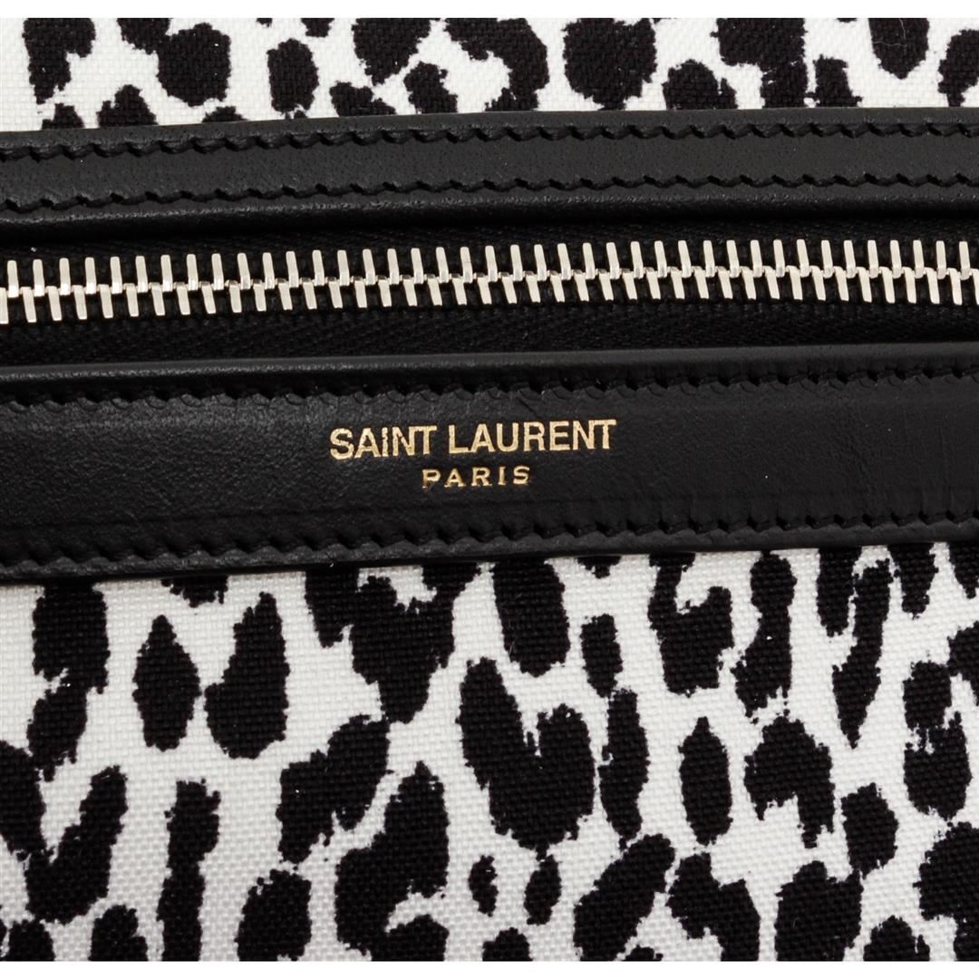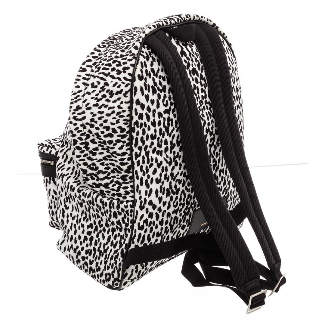 Saint Laurent black white Babycat print canvas Hunting Line backpack with black lining, interior zip pocket along back wall, front zip pocket, adjustable shoulder straps, two way zip closure. Authentic.