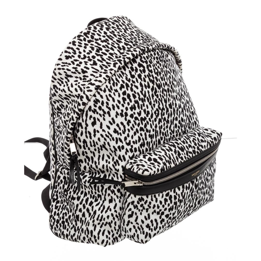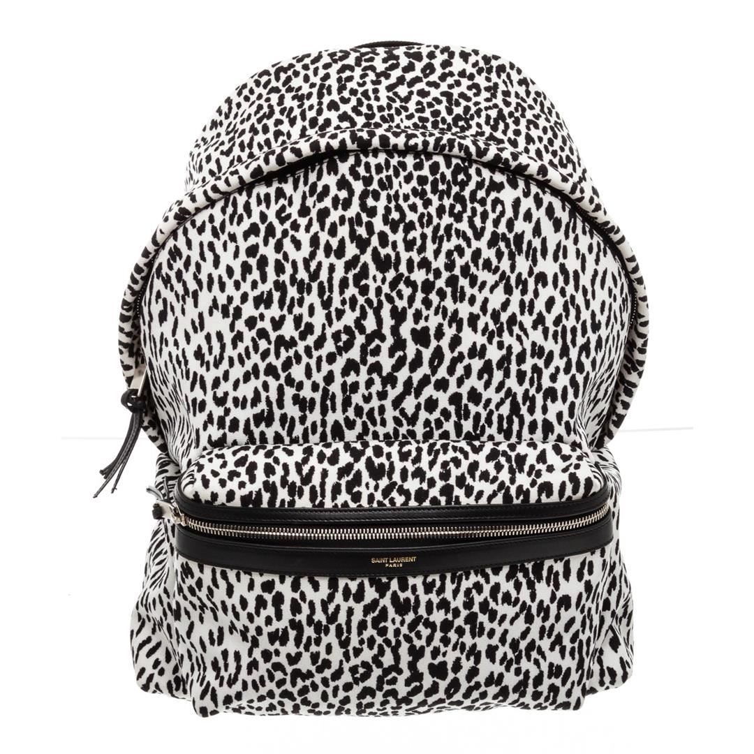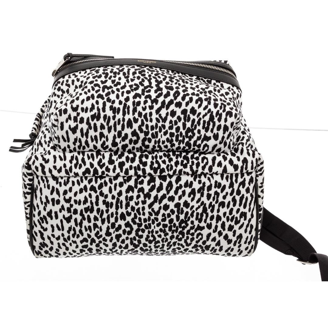 Saint Laurent black white Babycat print canvas Hunting Line backpack with black lining, interior zip pocket along back wall, front zip pocket, adjustable shoulder straps, two way zip closure. Authentic.