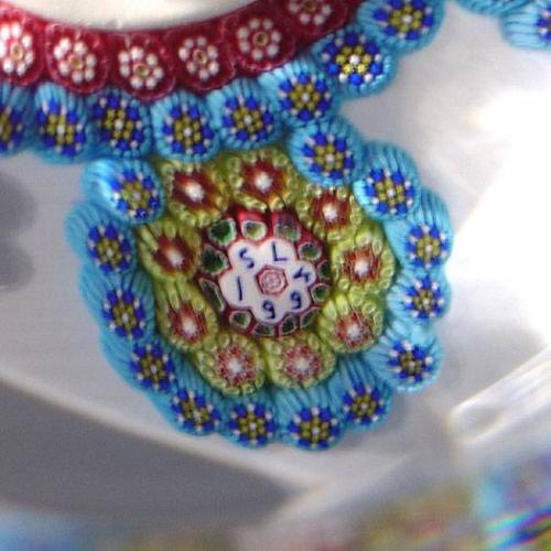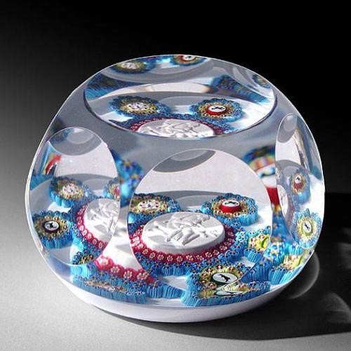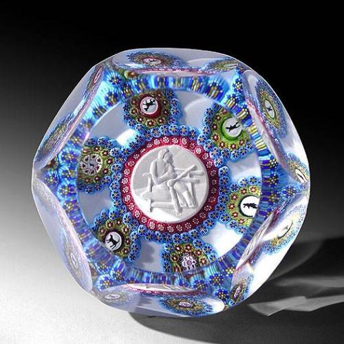 Saint Louis 1994 special edition paperweight, with a central sulphide of a paperweight maker, encircled by two concentric rings of millefiori, and bordered by six spaced circlets of canes, each with a central silhouette cane, on white ground. Six and one facets. "SL 1994" signature/date cane. Edition # 12 of a limited edition of 25, exclusive for L. H. Selman Ltd. Diameter 3 1/4".