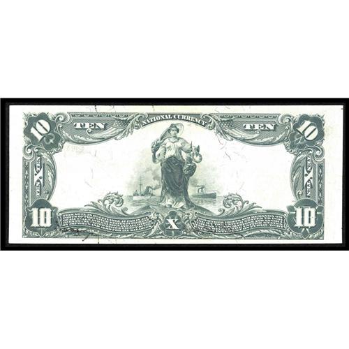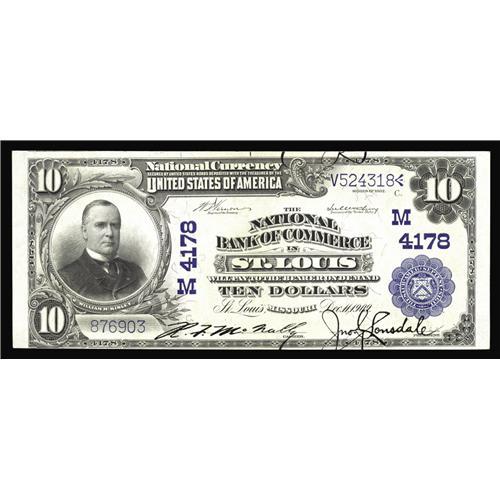 <B>Saint Louis, MO</B></I> - $10 1902 Plain Back Fr. 627 <B>The NB of Commerce</B></I> Ch. # (M)4178<BR>This prolific issuer is the source of one of the nicer uncirculated hoards of $5 Brown Backs available to the collecting fraternity, but is less abundant in higher grade in the Third Charter designs. Tonight's example is enhanced by pristinely Gem paper surfaces, but fails to make that lofty grade due to bottom centering issues. <B>Choice Crisp Uncirculated.</B></I>