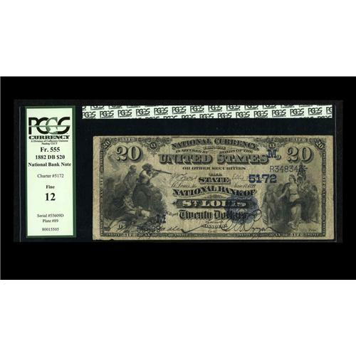 <B>Saint Louis, MO</B></I> - $20 1882 Date Back Fr. 555 <B>The State NB</B></I> Ch. # (M)5172<BR>This example which doesn't appear in current census data has been designated <B>Fine 12</B></I> by PCGS.