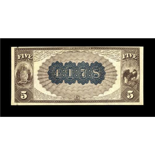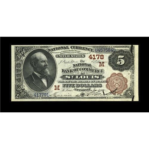 <B>Saint Louis, MO</B></I> - $5 1882 Brown Back Fr. 474 <B>The NB of Commerce</B></I> Ch. # (M)4178<BR>A lovely $5 Brown Back from a run of uncirculated specimens which has provided collectors with well nigh perfect specimens for type for many decades. The original embossing here is dramatically evident, and the colors, quality, and signatures are as nice as any. <B>Choice Crisp Uncirculated,</B></I> with only the barely close top margin taking this from the Gem class.<BR><BR><b>Shipping:</b> Coin/Currency (<a target="_blank" href="http://www.heritageauctions.com/common/shipping.php">view shipping information</a>)