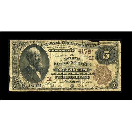 <B>Saint Louis, MO</B></I> - $5 1882 Brown Back Fr. 474 <B>The NB of Commerce</B></I> Ch. # (M)4178<BR>This <B>Very Good</B></I> $5 Brown Back comes from an issuer well known as a source of uncirculated notes of this type and denomination. This more experienced example will be available at a considerably lower level.<BR><BR><b>Shipping:</b> Coin/Currency (<a target="_blank" href="http://www.heritageauctions.com/common/shipping.php">view shipping information</a>)