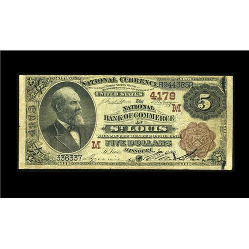 <B>Saint Louis, MO</B></I> - $5 1882 Brown Back Fr. 474 <B>The NB of Commerce</B></I> Ch. # (M)4178<BR>A <B>FIne</B></I> $5 Brown Back from an institution well known for the population of nicer uncirculated notes of this same type and denomination which survive from here.