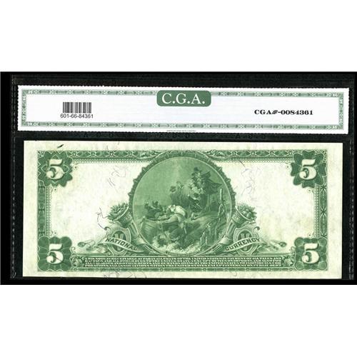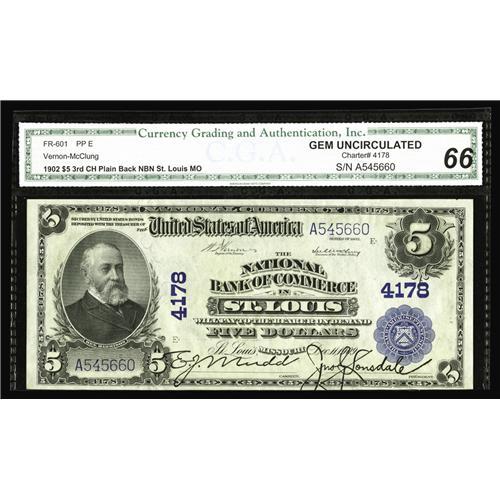 <B>Saint Louis, MO</B></I> - $5 1902 Plain Back Fr. 601 <B>The NB of Commerce</B></I> Ch. # 4178<BR>This bank issued many Third Charter fives resulting in the needed use of a prefix letter A for its serial numbers near the end of the large note era. The plate letter is E5 on this A prefix note. <B>CGA Gem Uncirculated 66.</B></I>