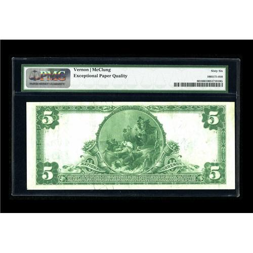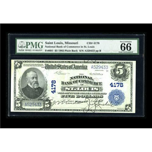 <B>Saint Louis, MO</B></I> - $5 1902 Plain Back Fr. 601 <B>The NB of Commerce</B></I> Ch. # 4178<BR>This bank had a large enough 1902 issue to warrant an A prefix on its later notes. This is such a note, and it also carries plate letter B5, which signifies the fifth time through the alphabet for its $5 plates. Likely one of the nicest examples from here grading <B>Gem Uncirculated 66 EPQ</B></I> from PMG.<BR><BR><b>Shipping:</b> Coin/Currency (<a target="_blank" href="http://www.heritageauctions.com/common/shipping.php">view shipping information</a>)