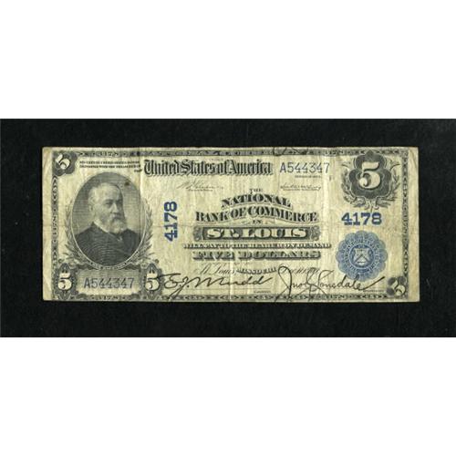 <B>Saint Louis, MO</B></I> - $5 1902 Plain Back Fr. 601 <B>The NB of Commerce</B></I> Ch. # 4178<BR> A pinhole is noticed on this strongly signed note. <B>Fine.</B></I><BR><BR><b>Shipping:</b> Coins & Currency (<a target="_blank" href="http://www.heritageauctions.com/common/shipping.php">view shipping information</a>)