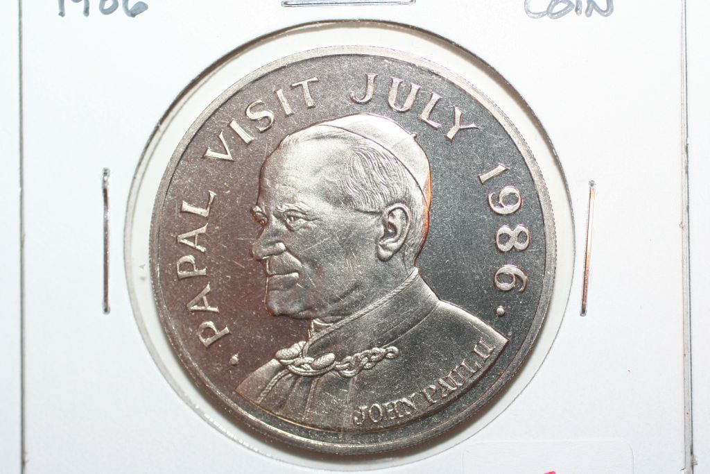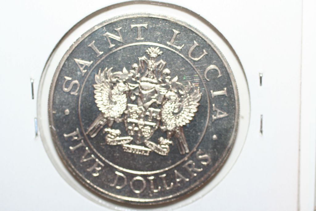 This lot is a 1986 saint lucia $5 coin; john paul II