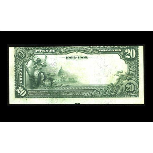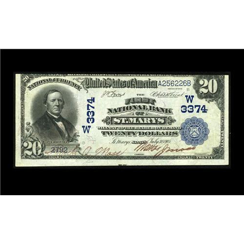 <B>Saint Marys, KS</B></I> - $20 1902 Date Back Fr. 643 <B>The First NB</B></I> Ch. # (W)3374<BR>The trimming department at this institution was apparently pressed into service with inadequate training, as the top margin is cut in and the bottom margin is far larger than normal. The original embossing is readily apparent and although we doubt this note ever saw any actual circulation, there are a few folds and miscellaneous handling indications from careless storage, so we feel that <B>About Uncirculated</B></I> would offer the fairest description.